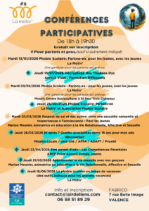 • Des conférences participatives : tous les mois un thème est abordé, en présence d’un professionnel : phobie scolaire, harcèlement, adolescence…
