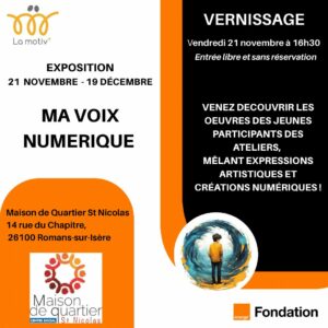 - Exposition « Ma voix numérique » à Romans-sur-IsèreExposition du 21 novembre au 19 décembre 2025 à Romans-sur-Isère. Venez découvrir les œuvres des jeunes participants des ateliers, mêlant expressions artistiques et créations numériques !